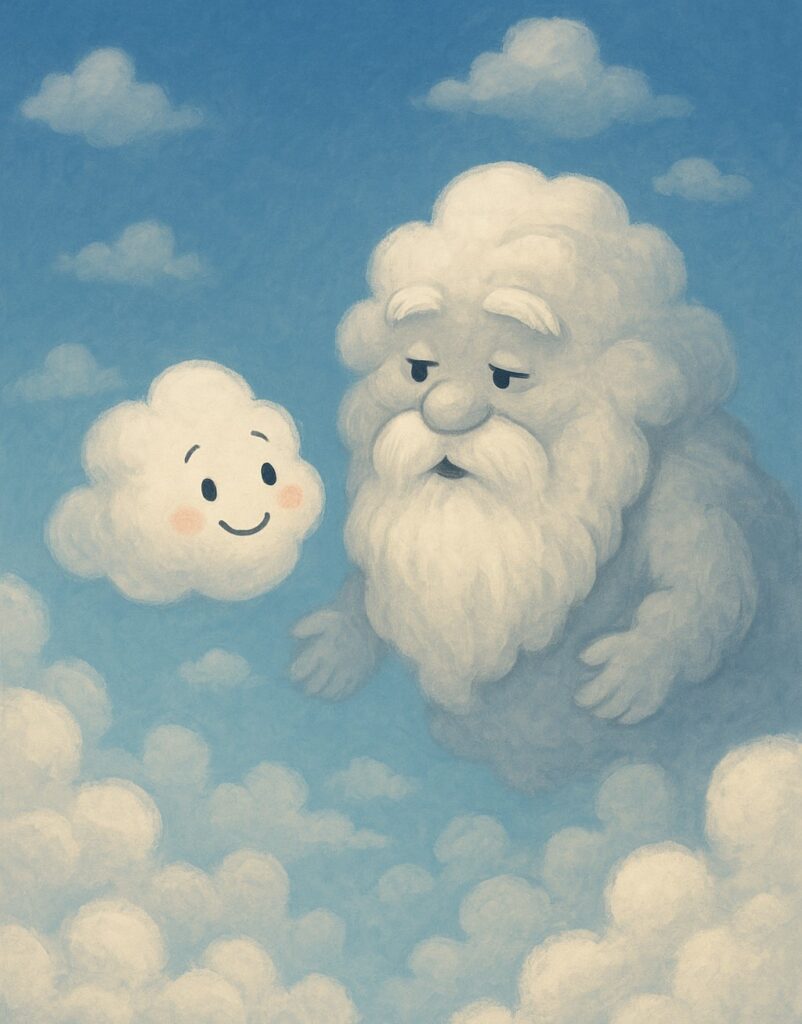 Postanowił więc to sprawdzić. Przeleciał do starszej chmury, która wyglądała jak dostojny staruszek z brodą z mgły – to był Pan Nimbus, najstarszy w całym niebie.