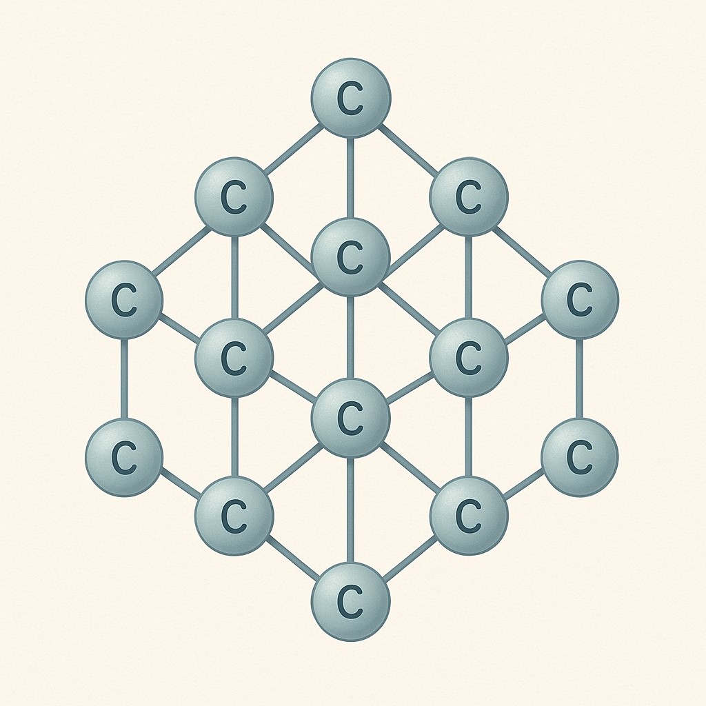 Diament jest odmianą węgla (C), w której atomy są połączone kowalencyjnymi wiązaniami o bardzo dużej energii. Każdy atom węgla w diamencie ma hybrydyzację sp³ i tworzy cztery bardzo silne wiązania z czterema sąsiednimi atomami.
