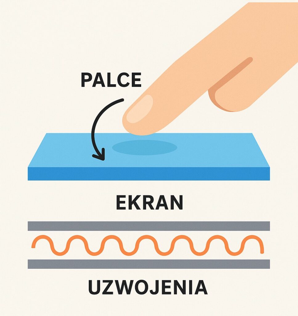 W środku ekran ma cienką warstwę specjalnego materiału, który przechowuje niewidzialny ładunek elektryczny i tworzy stabilne pole, coś jak niewidzialna pajęczyna energii. Kiedy dotykasz palcem ekran, Twój palec „przeszkadza” tej niewidzialnej pajęczynie – zmienia w tym miejscu trochę energii.