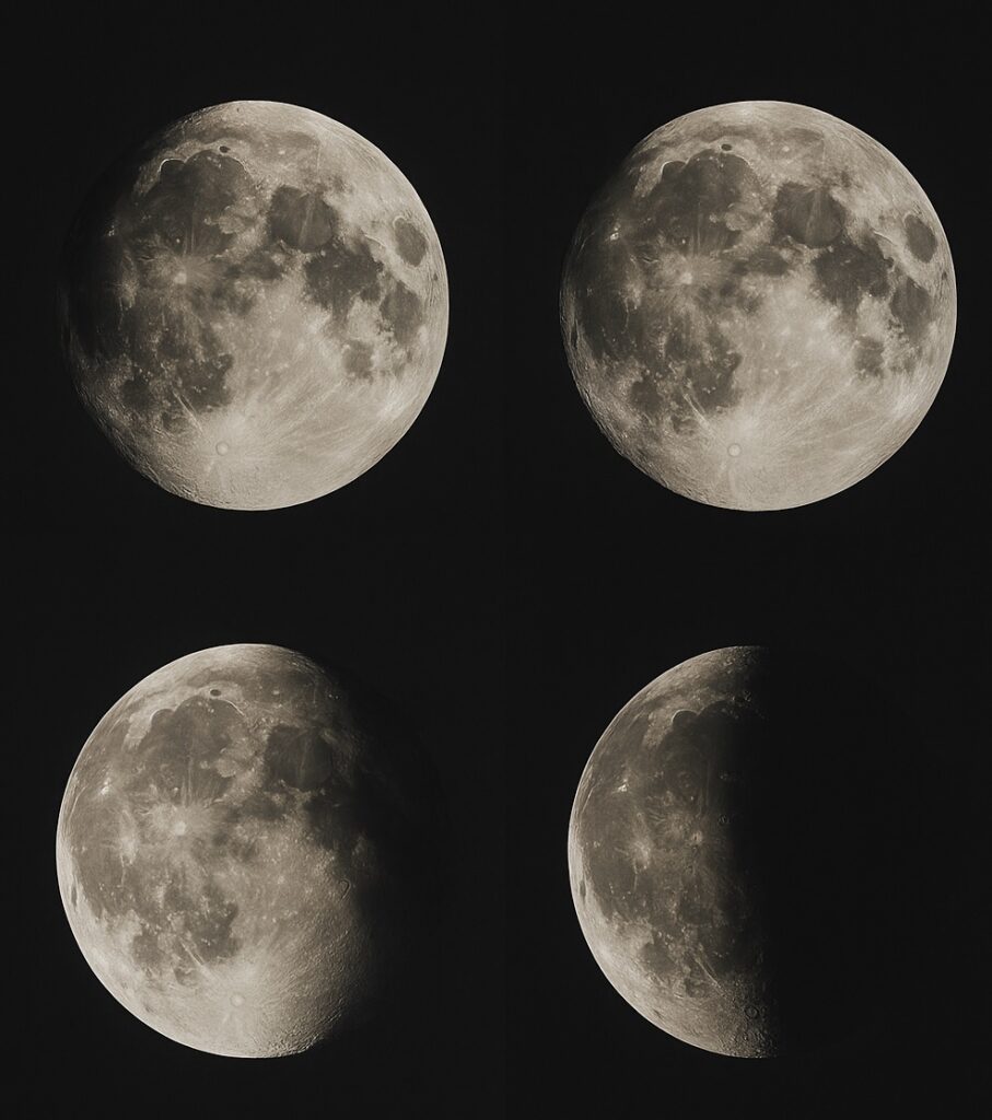 • Ubywający Księżyc: jasna część maleje, od pełni do nowiu.