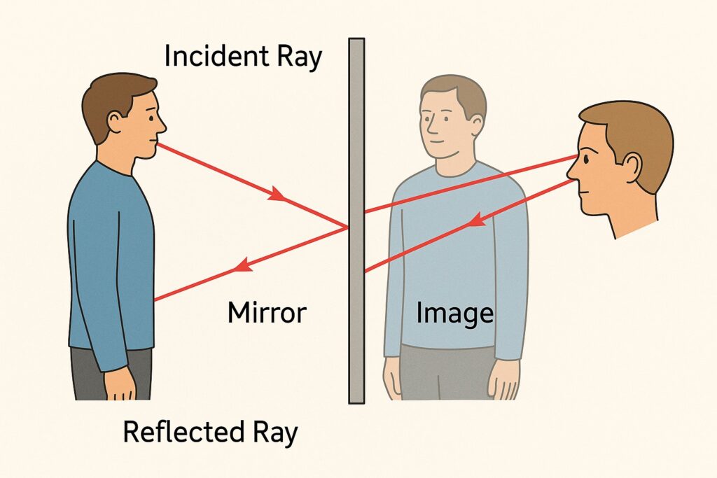 Lustro działa dzięki odbiciu zwierciadlanemu – promienie światła, które padają na gładką powierzchnię, odbijają się pod tym samym kątem, pod jakim na nią padają. Jeśli promień pada pod kątem 30° do powierzchni, odbije się również pod kątem 30°, ale po drugiej stronie normalnej (linii prostopadłej do powierzchni). Dzięki temu oko widzi obraz tak, jakby znajdował się „za” lustrem, w tej samej odległości, co rzeczywisty obiekt przed nim.