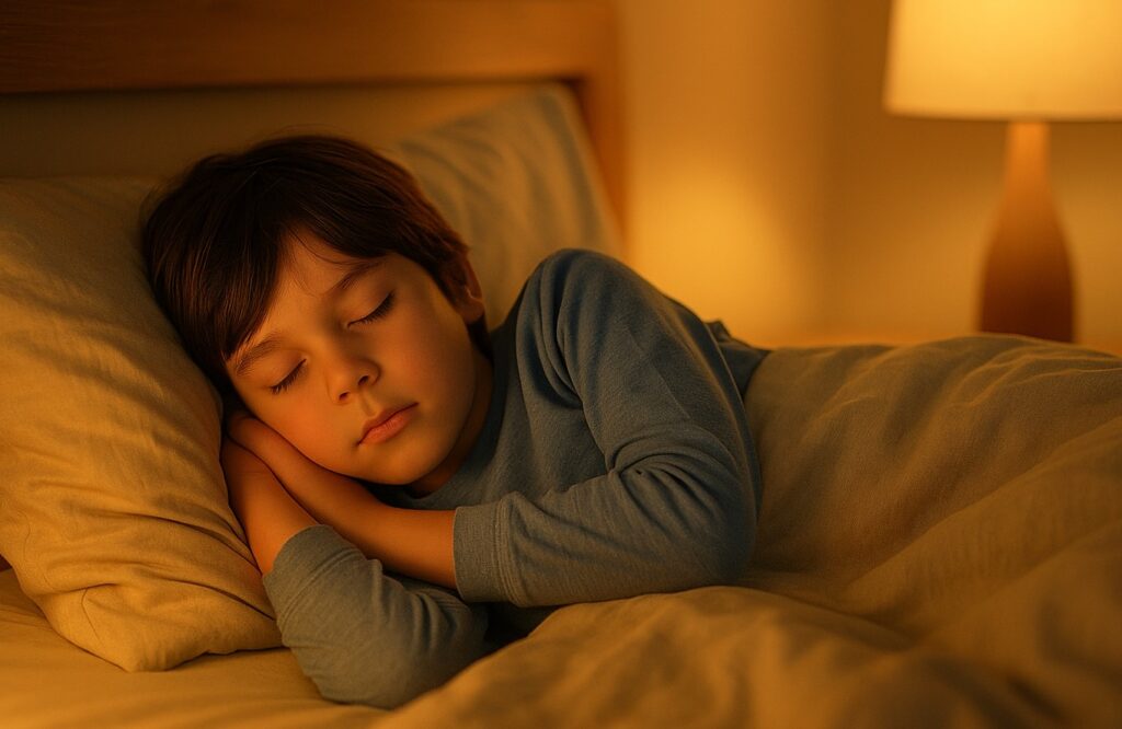 Mały Tymek właśnie położył się spać. Było cicho, a tylko lampka świeciła miękkim światłem. Myślał jeszcze o tym, co będzie jutro robił — może pójdzie na plac zabaw, a