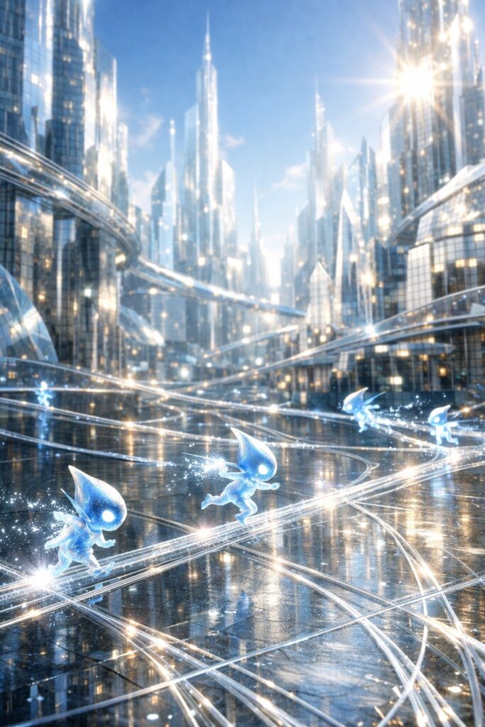 Nie było to zwykłe miasto – jego ulice lśniły cienkimi, srebrzystymi liniami, które skrzyły się w słońcu niczym pajęczyny utkane ze światła, a budynki, zamiast kamienia i drewna, były zrobione z błyszczącego szkła i połyskujących kryształów. W Elektroniku mieszkały maleńkie istotki zwane Elektronami. Były szybkie, niemal niewidzialne, i odpowiedzialne za przesyłanie energii oraz informacji w całym mieście. Każdy ruch, każda iskierka światła, każdy sygnał powstawał dzięki nim.