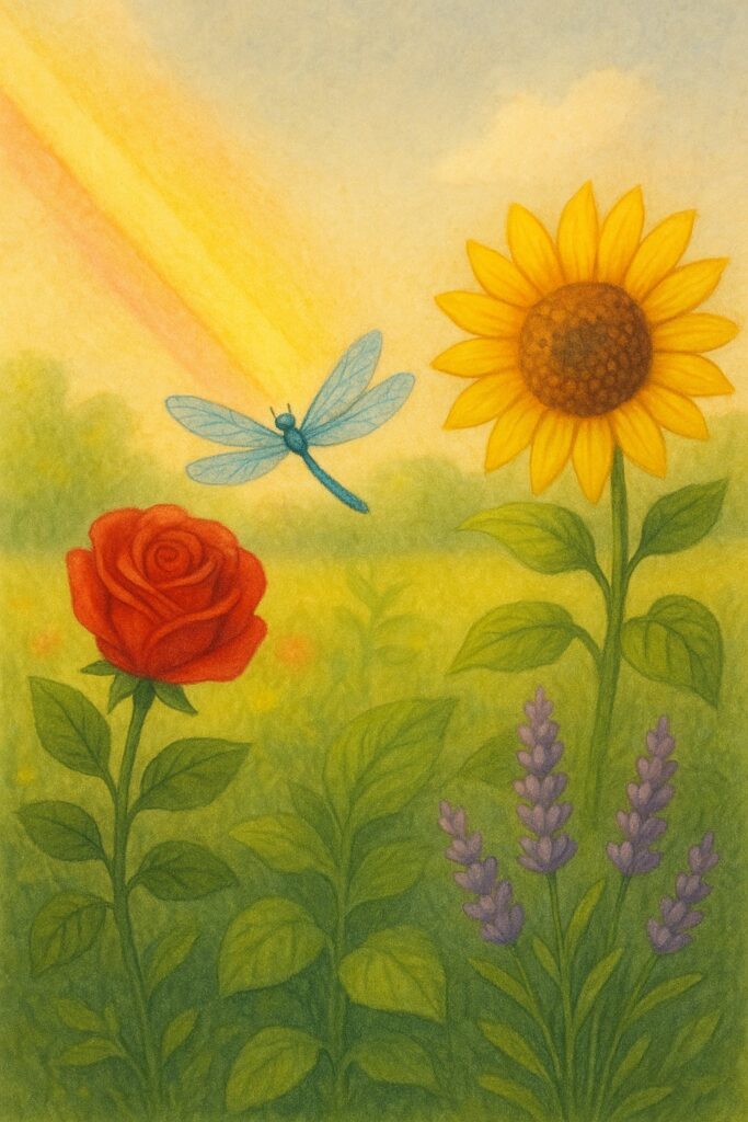 Popatrzył w dół i zobaczył łąkę – zieloną, jakby ktoś pomalował ją szczęściem. Kwiaty mieniły się czerwienią, błękitem i złotem. Motyle miały skrzydła jak małe dzieła sztuki.