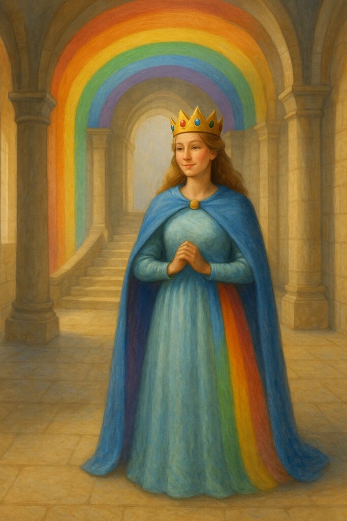 Na szczycie siedziała Królowa Kolorów, cała zrobiona ze światła. Jej szaty mieniły się każdym odcieniem, jaki można było sobie wyobrazić. Kiedy spojrzała na Promyka, jej twarz rozjaśnił uśmiech.