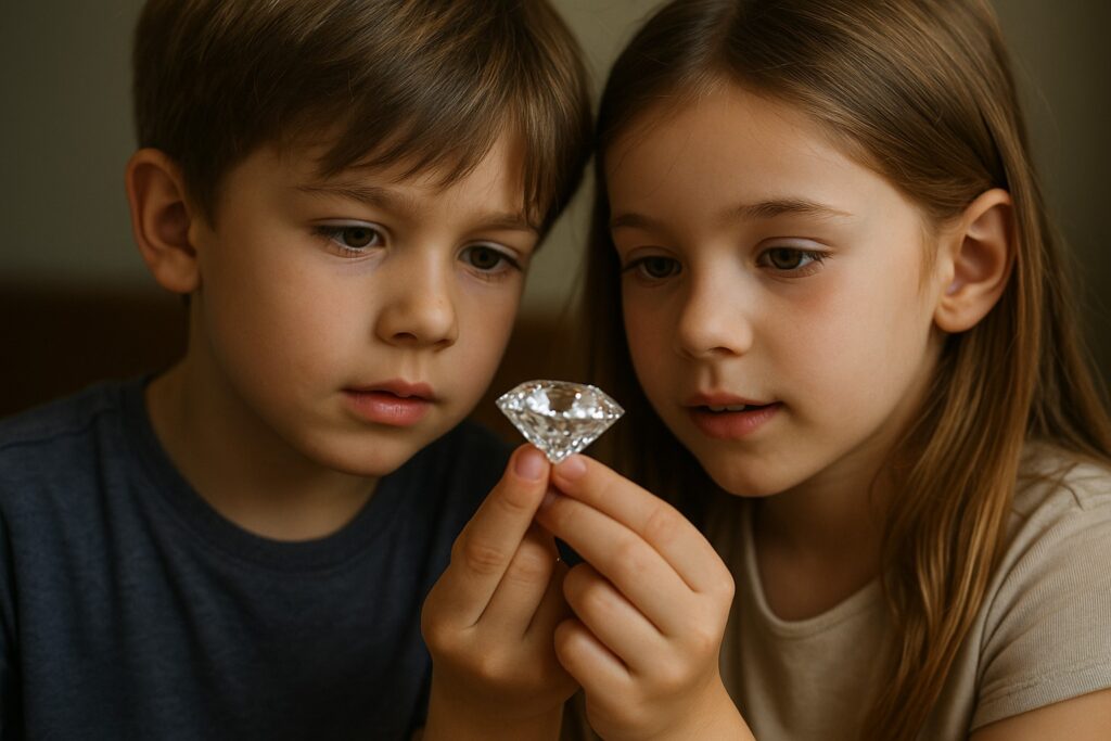 – Dokładnie – zaśmiał się tata. – Dlatego diament jest tak twardy, że można nim ciąć szkło, wiercić w skałach, a nawet używać go w specjalnych narzędziach. W jubilerstwie służy też do szlifowania innych kamieni, bo żaden nie jest twardszy od niego.